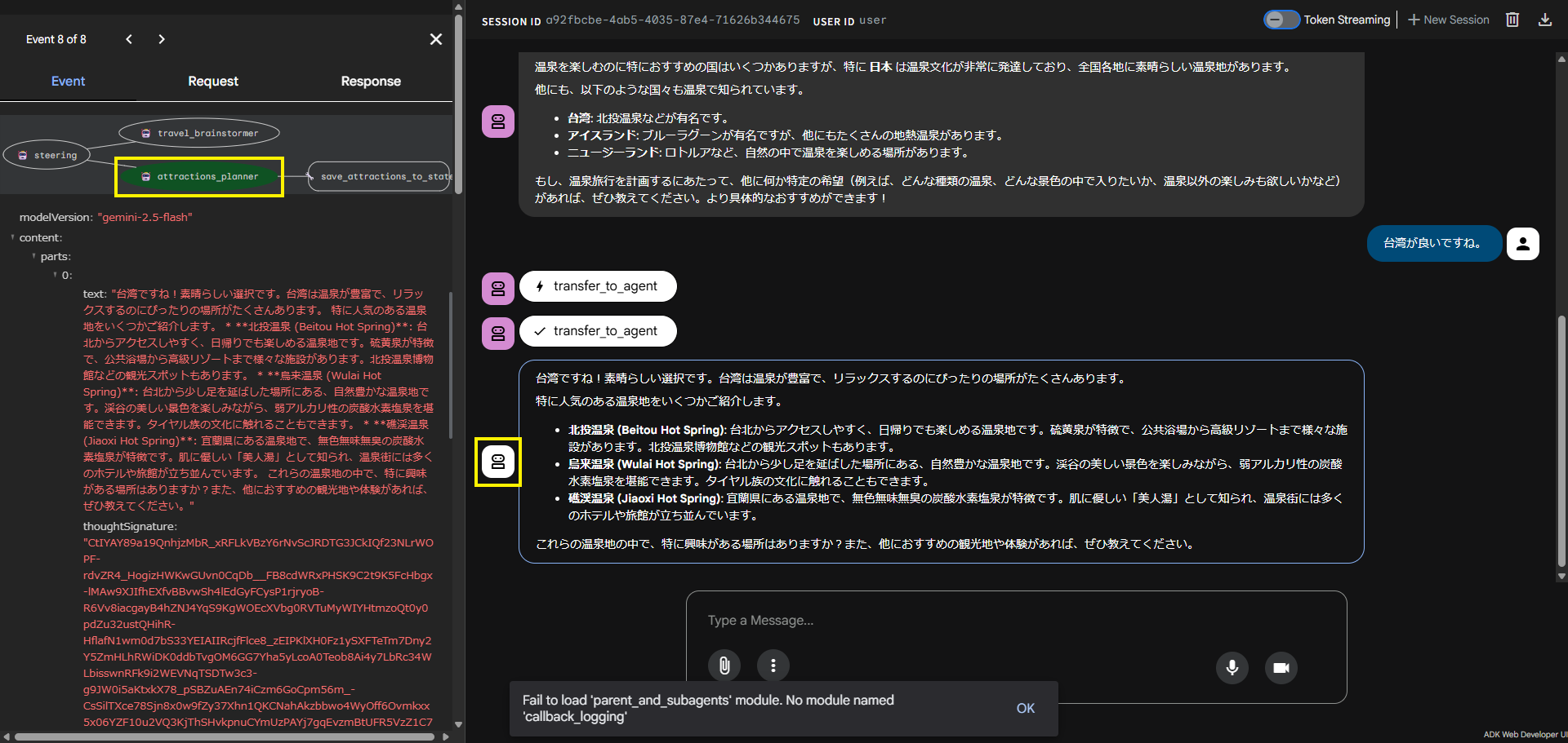 - 下記入力して、エージェント「attractions_planner」に振られるか試します。