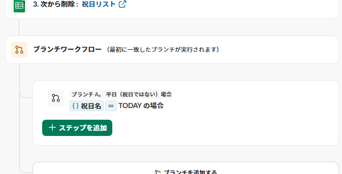 作成したブランチ(平日ルート)の中に、本来実行したいステップ(メッセージ送信やフォーム通知など)を配置して完了です。