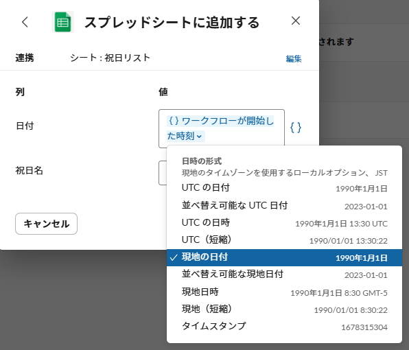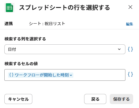 - ターゲット:「2.スプレッドシートの行を選択する」の結果にある「祝日名」