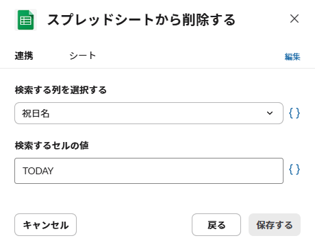 - アクション:Google Sheets「スプレッドシートから削除する」