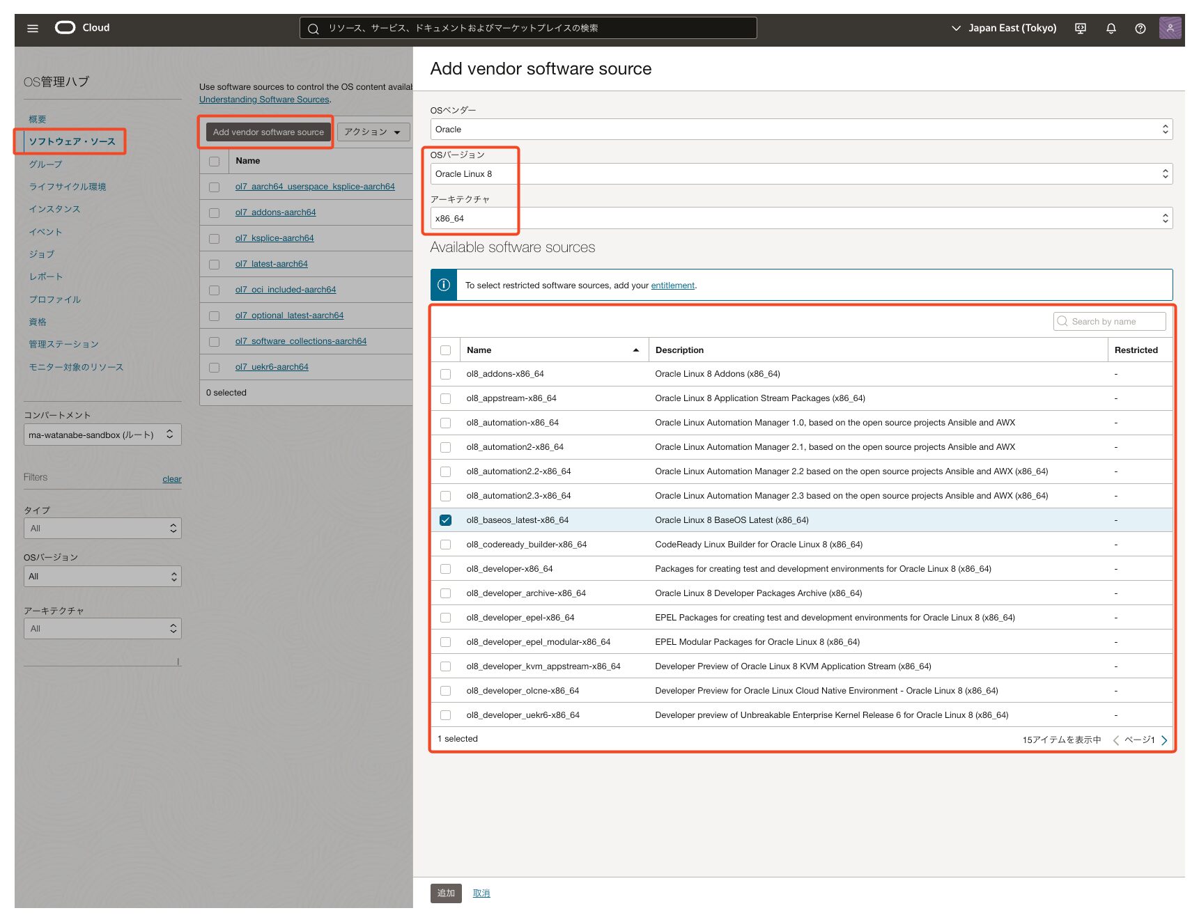 2026年3月現在、OS管理ハブを有効化した直後の状態では、デフォルトのベンダー・ソースとして Oracle Linux 7(OL7)用しか存在しません。今回の検証では Oracle Linux 8 (OL8) を使用するため、以下の手順でOL8用のソースを明示的に追加する必要があります。