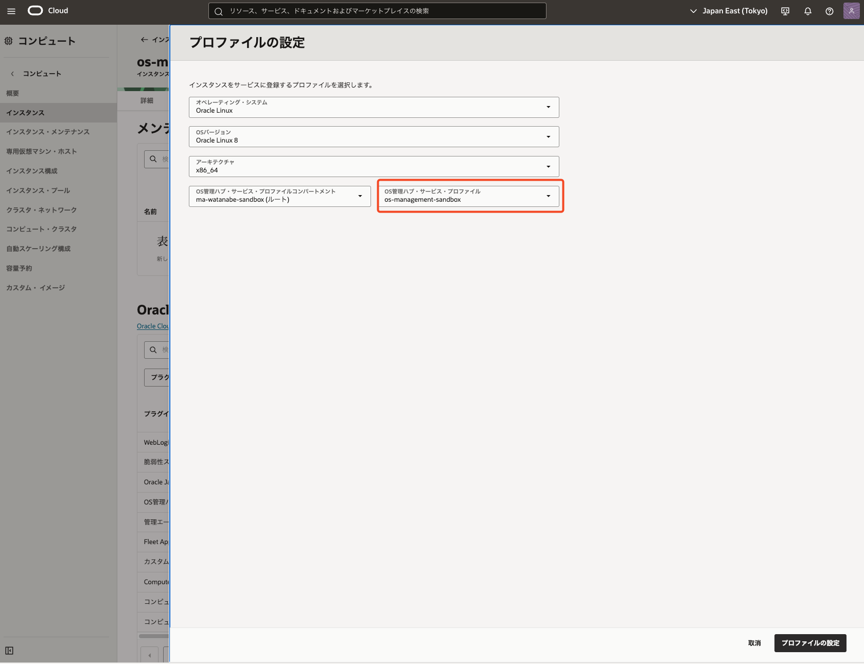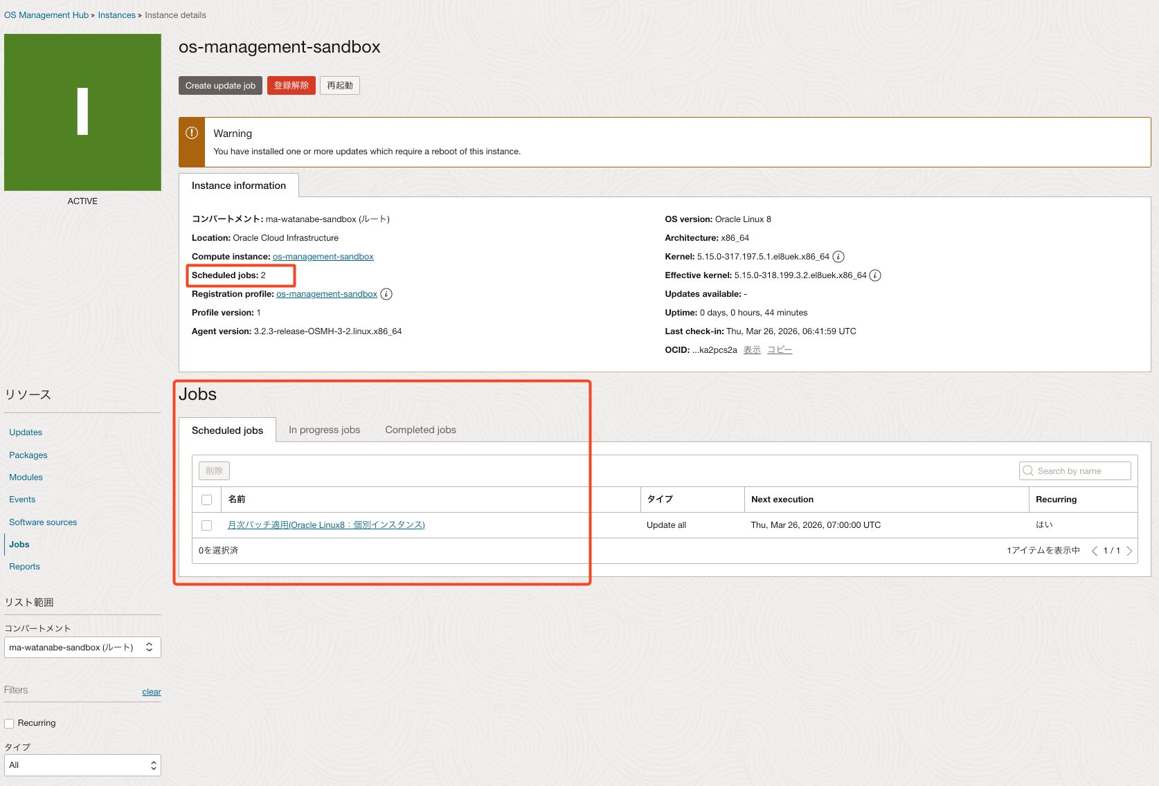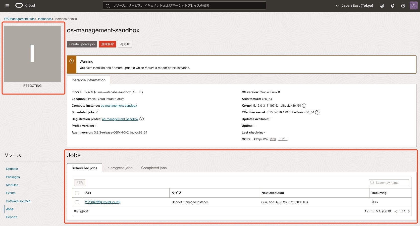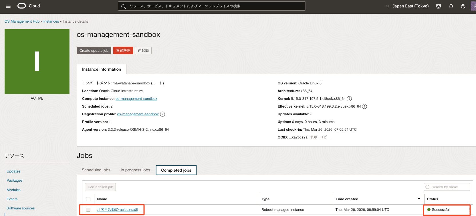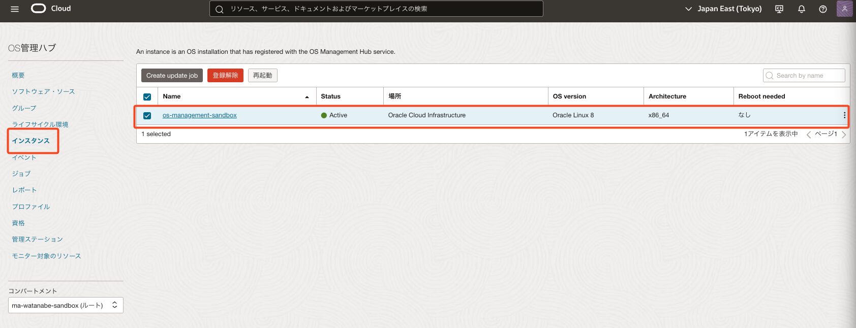 *今回はos-management-sandboxという名前のOracle Linux 8 インスタンスを事前に作成しています