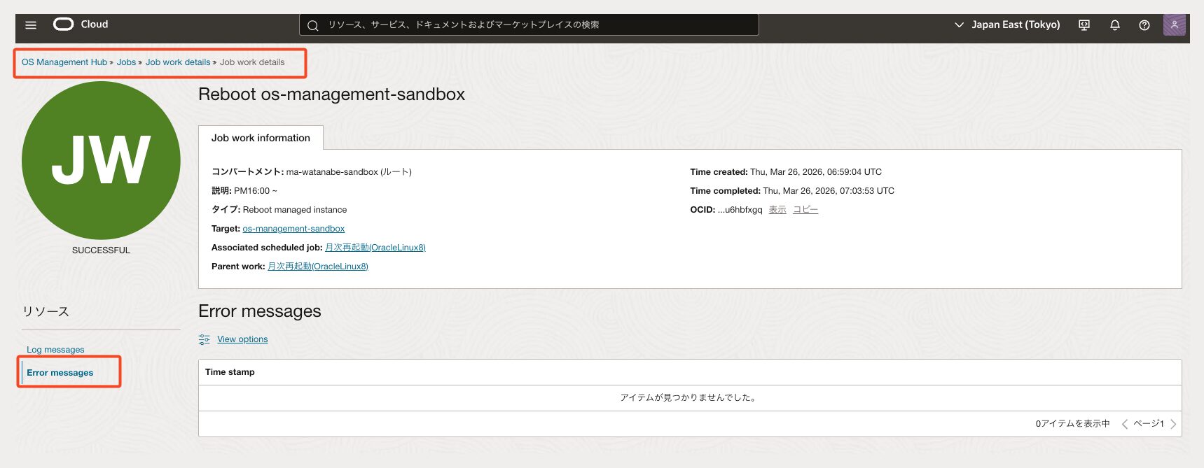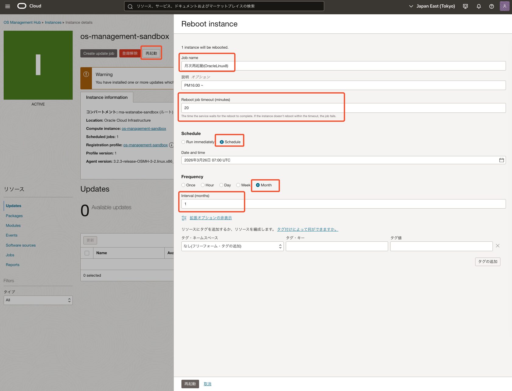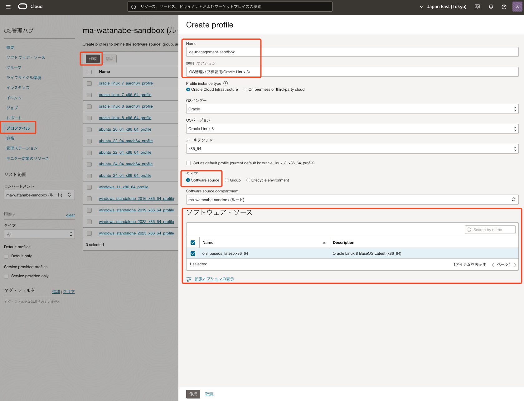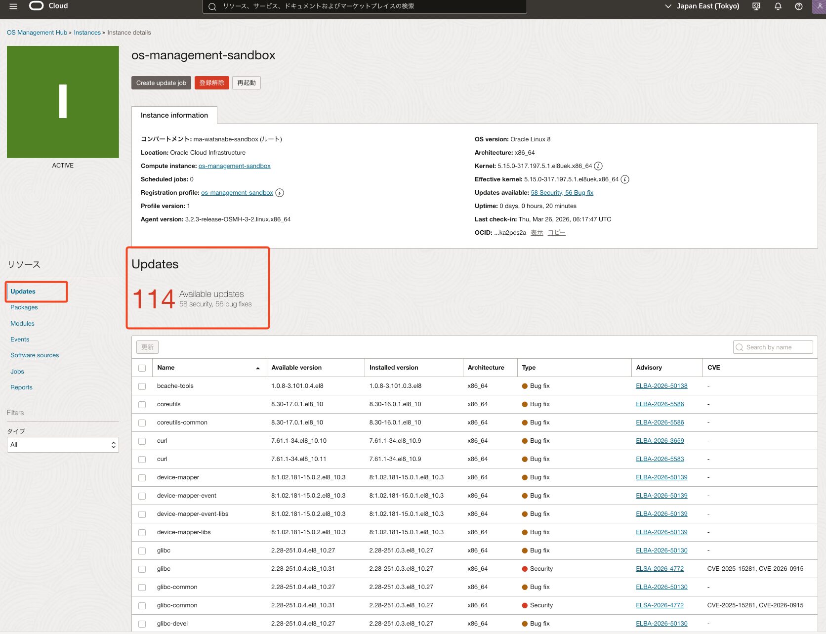 *今回はos-management-sandboxという名前のOracle Linux 8 インスタンスを事前に作成しています