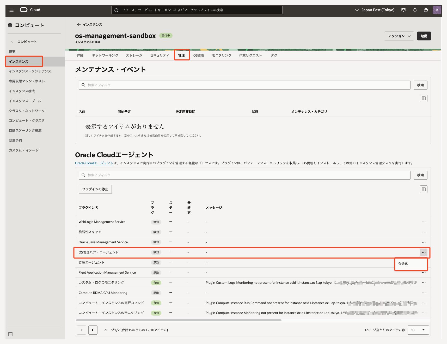- 下部の「Oracle Cloudエージェント」一覧にある [OS管理ハブ・エージェント] の右端にあるメニュー(点3つ)から [有効化] を選択