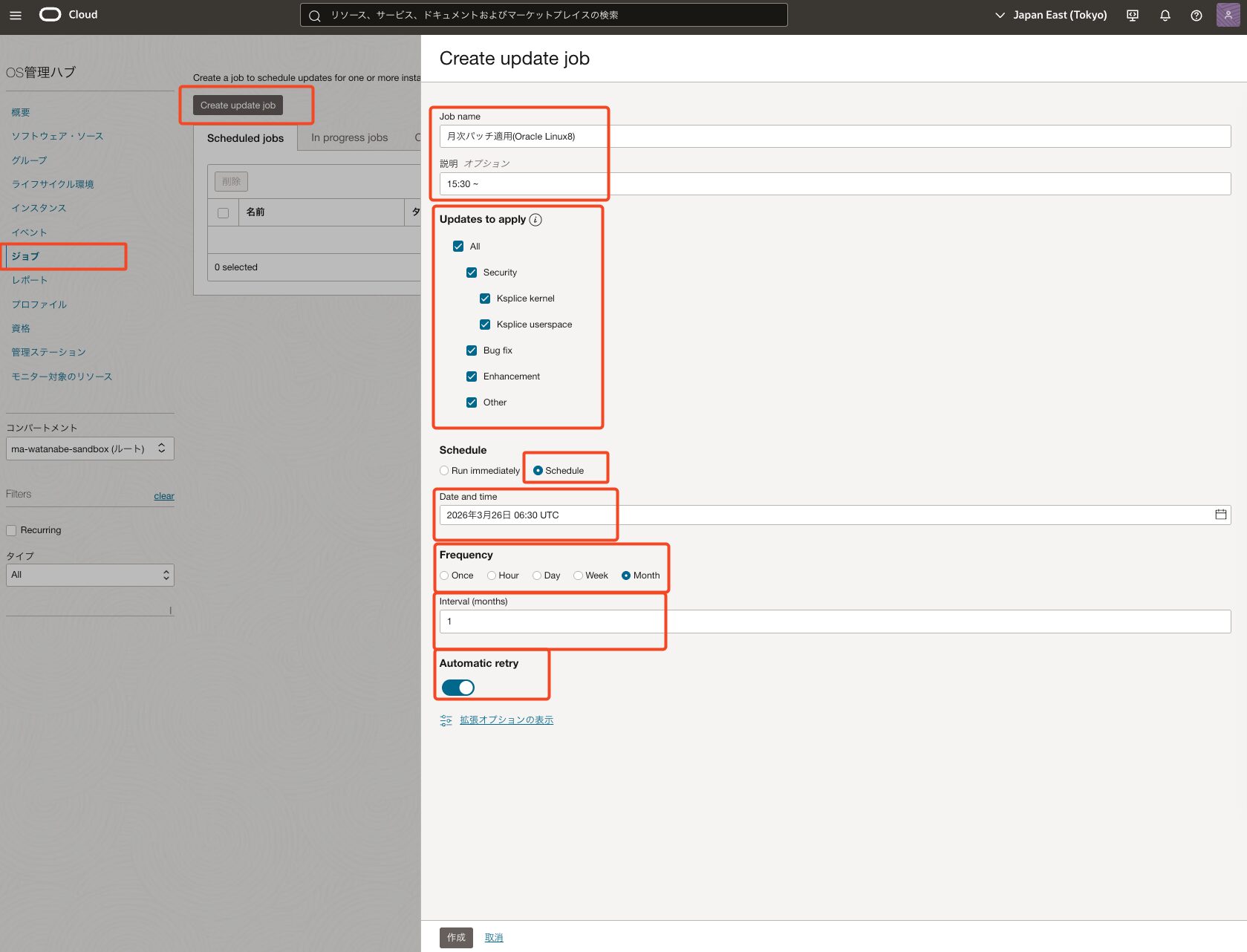 - [Job name] にジョブの名称を入力します(例:月次パッチ適用(Oracle Linux8))。