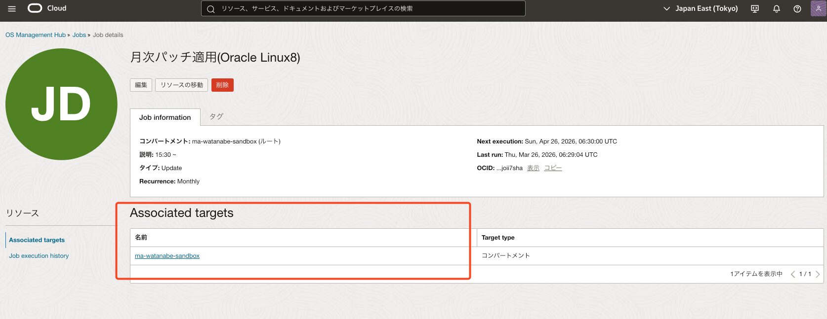 ターゲットの指定について今回は [ジョブ] メニューから作成したため、対象は「コンパートメント内の全インスタンス」となります。