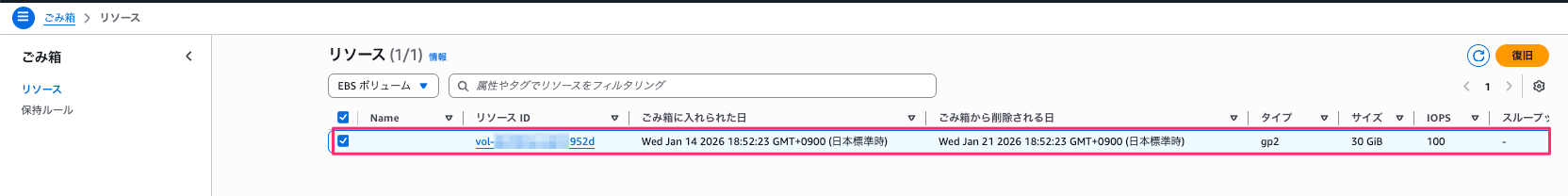 「ごみ箱」のリソース一覧を確認すると、削除したボリュームが保管されていることが分かります。