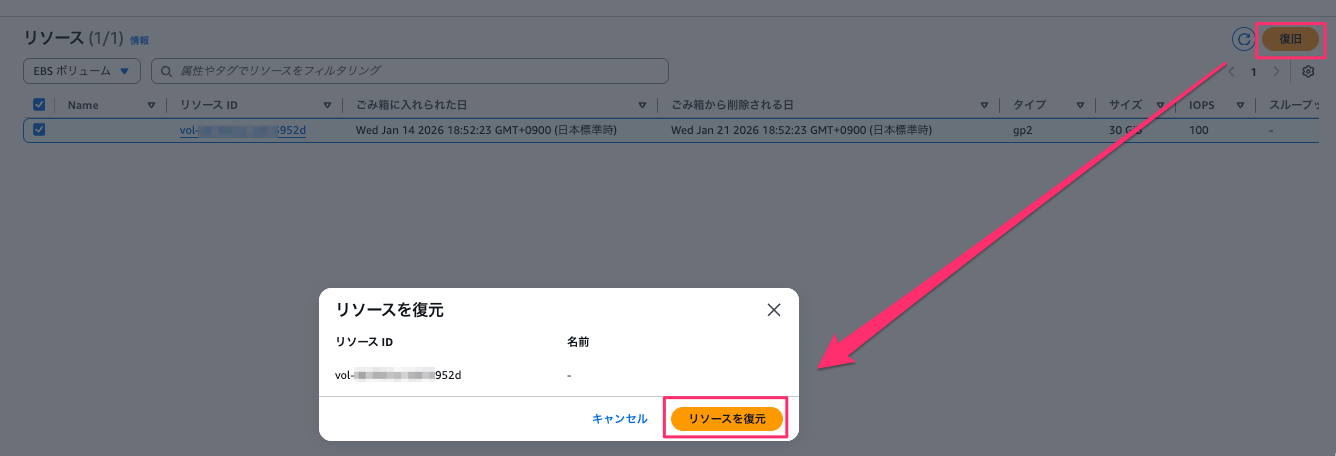 - 属性の完全な継承:ボリューム ID やタグ設定も、削除前の状態のまま復元されます。