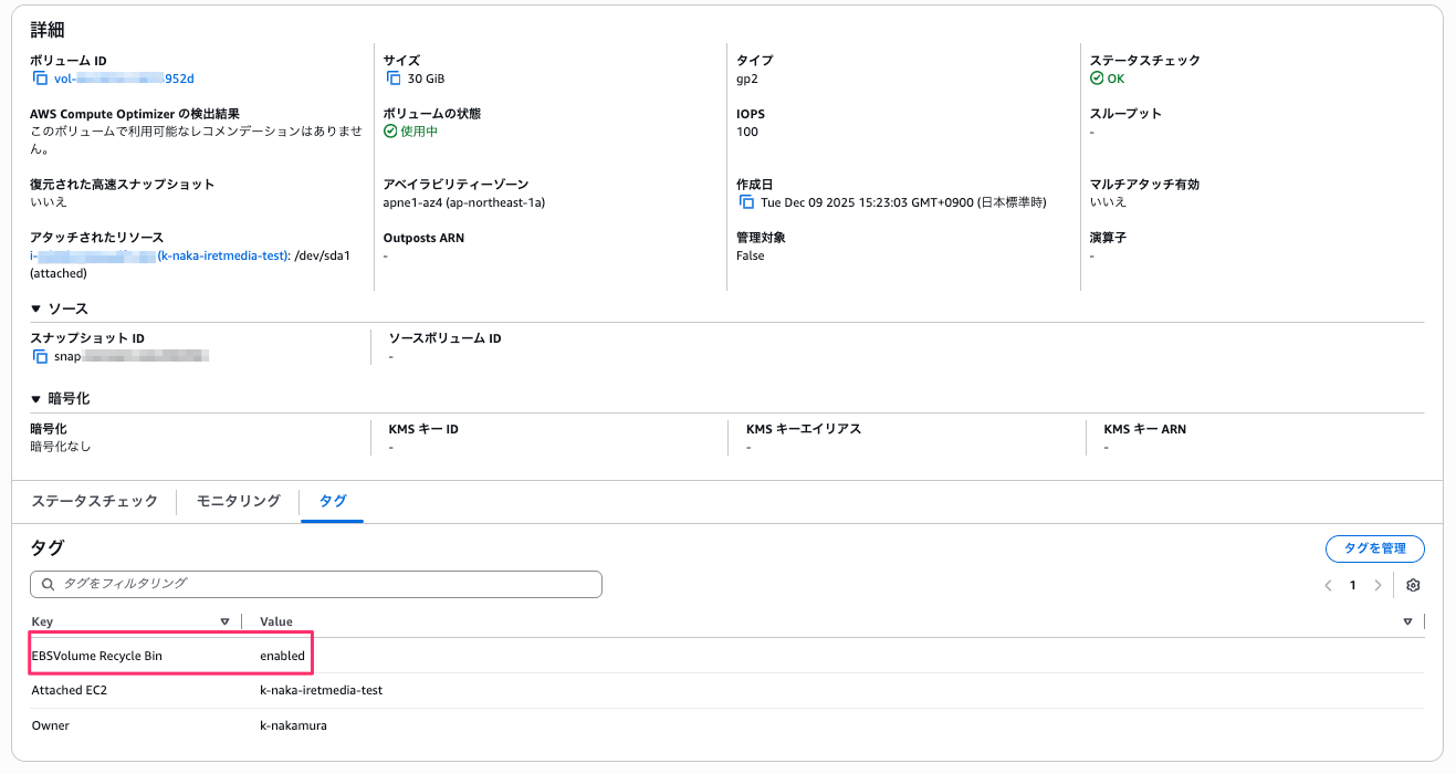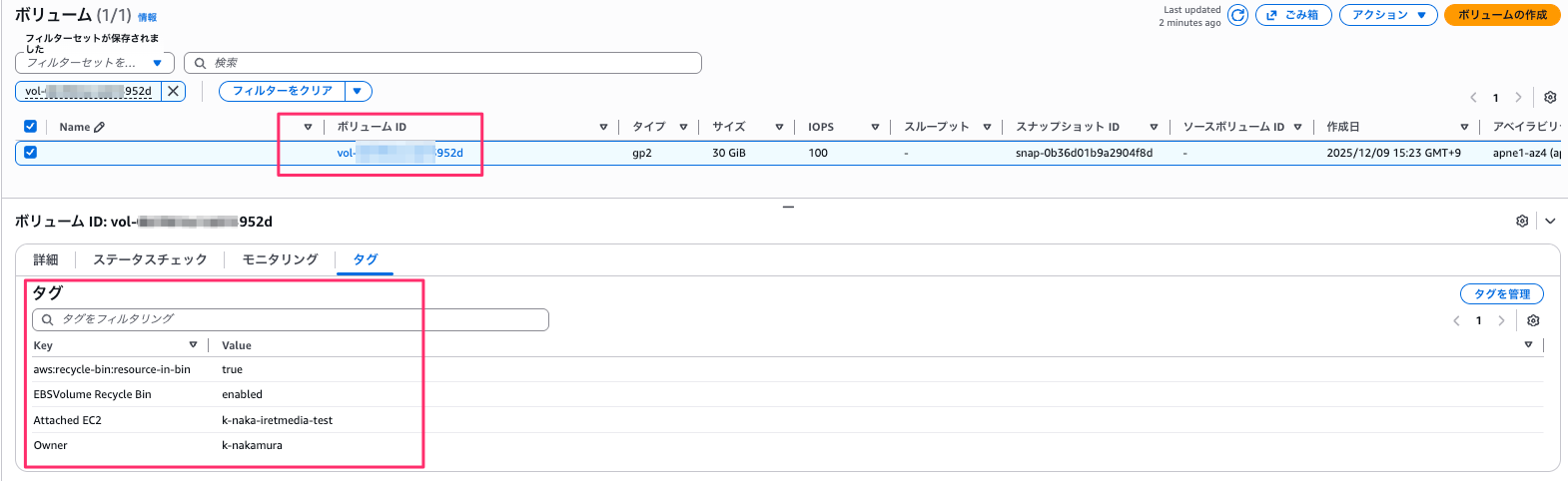 EBS ボリューム一覧を確認すると、ボリューム ID やタグが維持された状態で無事に復旧していました。