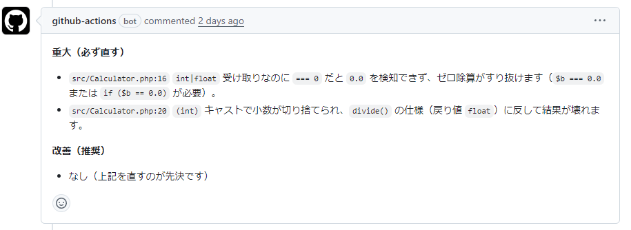 Codex による自動レビューで狙い通り、それらを正確に指摘できていることが確認できました。