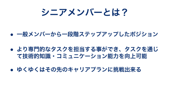 シニアメンバーとは、アイレット独自のポジションであり、一般メンバーから一段ステップアップした役割を担います。