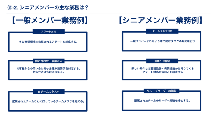 通常のアラート対応も継続して行いますが、一般メンバーよりもチームで進めている専門的なタスクに触れる機会が格段に多くなるのが特徴です。