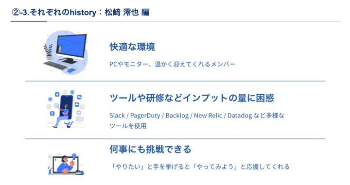入社当初は Slack や PagerDuty などの数多くのツールや、大量の技術研修に戸惑い、ミスが続いて自己肯定感が下がってしまった時期もあったと言います。