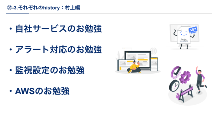 - 監視設定のお勉強:アラートがどのような仕組みで発報されるのかを理解することで、対応の質を上げる。