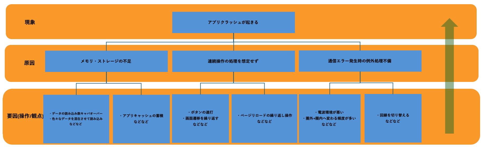 とある画面でボタンの連打(要因(操作/観点))をすることによって→連続操作の処理を想定しておらず(原因)→アプリクラッシュが起きてしまった(現象)に行き着くことができます。