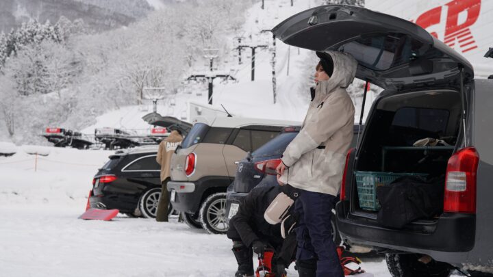 石田Kの車で先出ししたメンバーは、凍えるような寒さと雪の中で滑る準備。