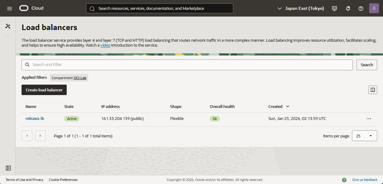 - インターネットからアクセス可能なロードバランサおよびバックエンドの Computeインスタンス(今回は Oracle Linux 9 にセットアップしたWeb サーバー)が構築済みであること 。