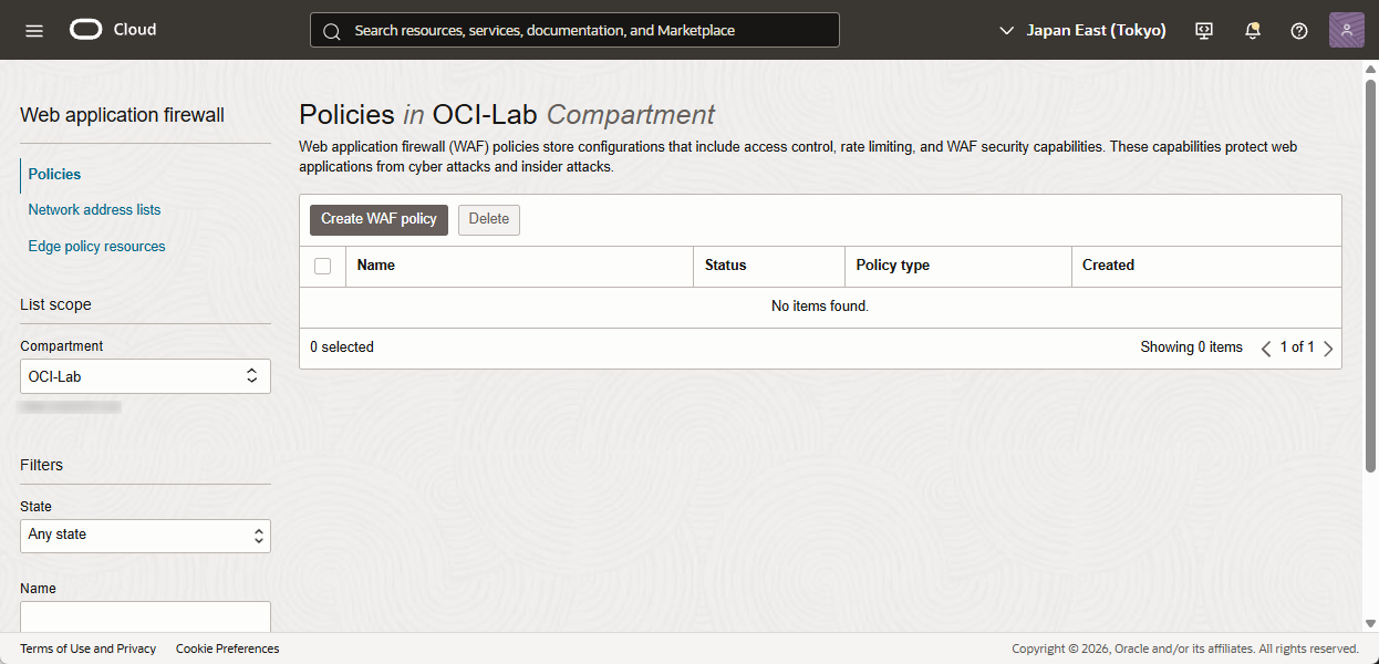 - OCIの管理コンソールにて、左ナビゲーションから「Identity & Security」→「Web application firewall」→「Policies」を選択します。