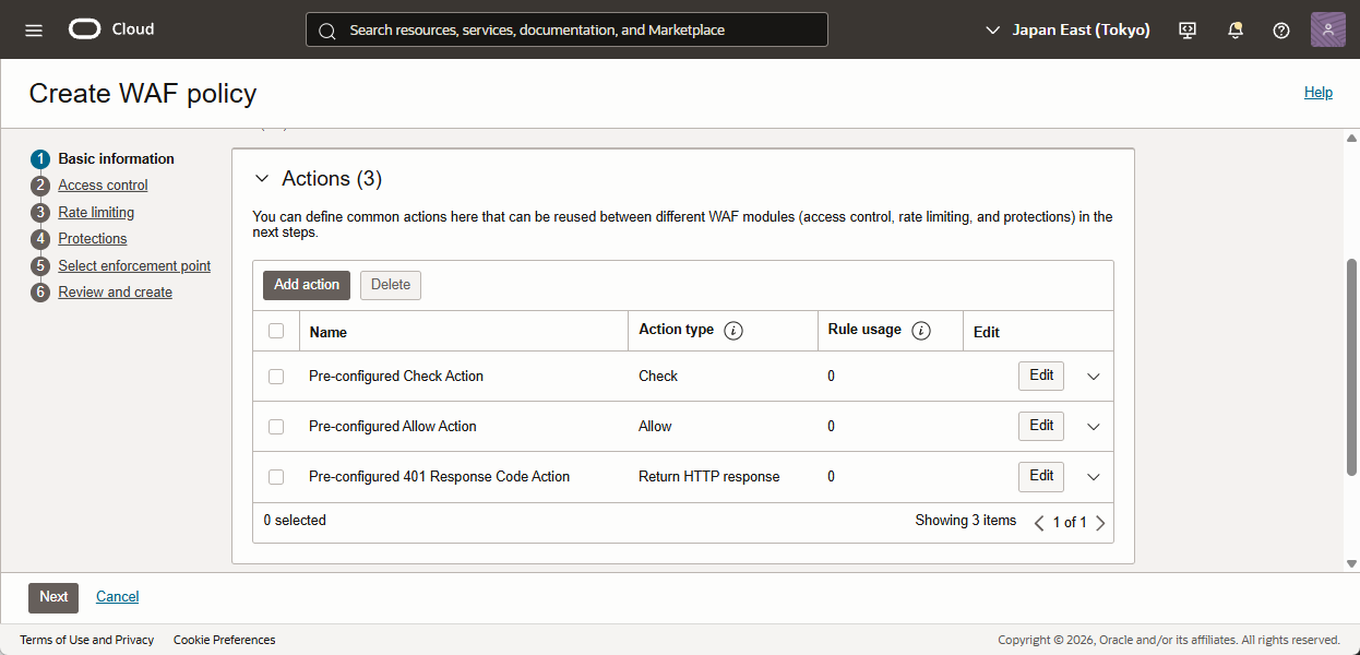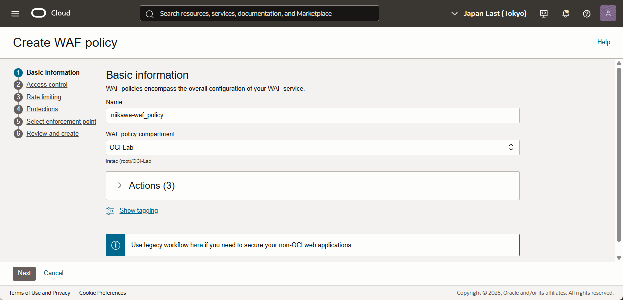 - WAF policy のName を入力、Compartmentを選択します。