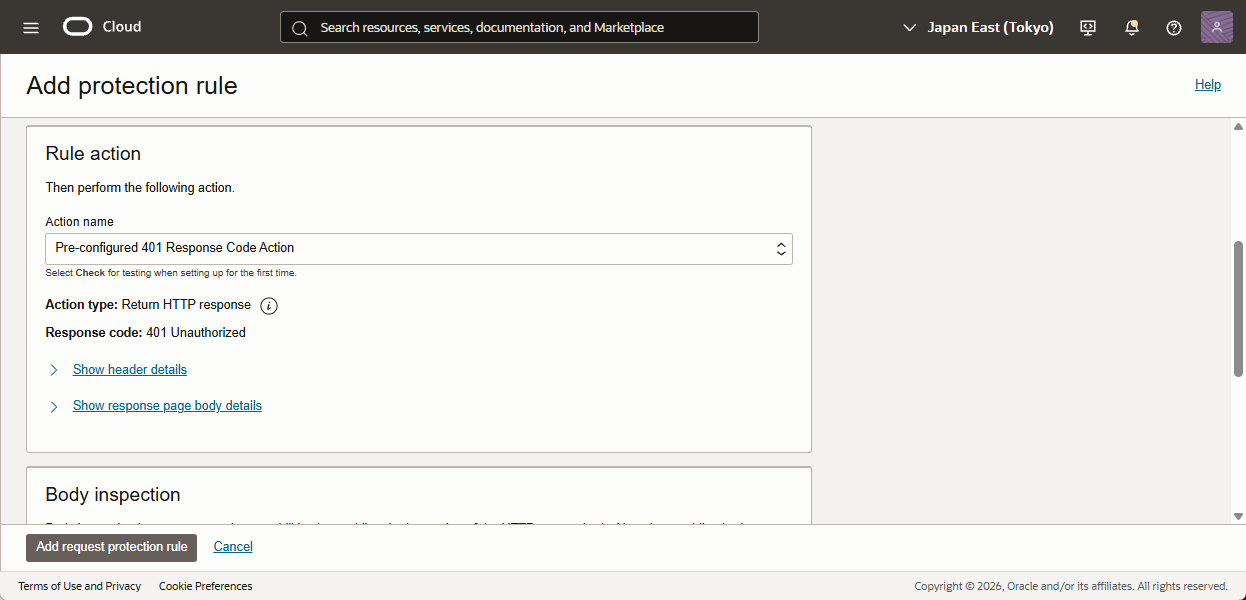 - ルールのAction を設定します。Action name に「Pre-configured 401 Response Code Action」を選択します。WAF のブロック時のデフォルト応答は 403 Forbiddenとなりますが、今回追加したルールの動作を識別しやすくするため、あえて401 Unauthorized を選択しています。