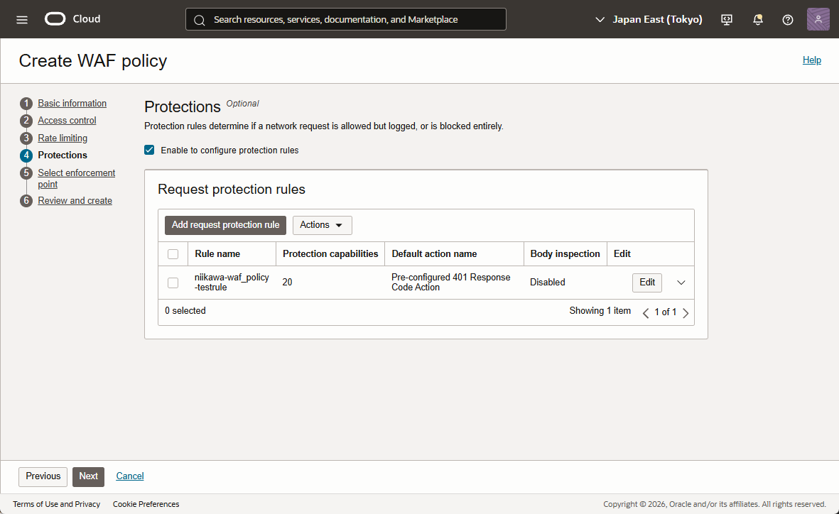 - Protections において「Enable to configure protection rules」を選択します。「Add request protection rule」を選択します。