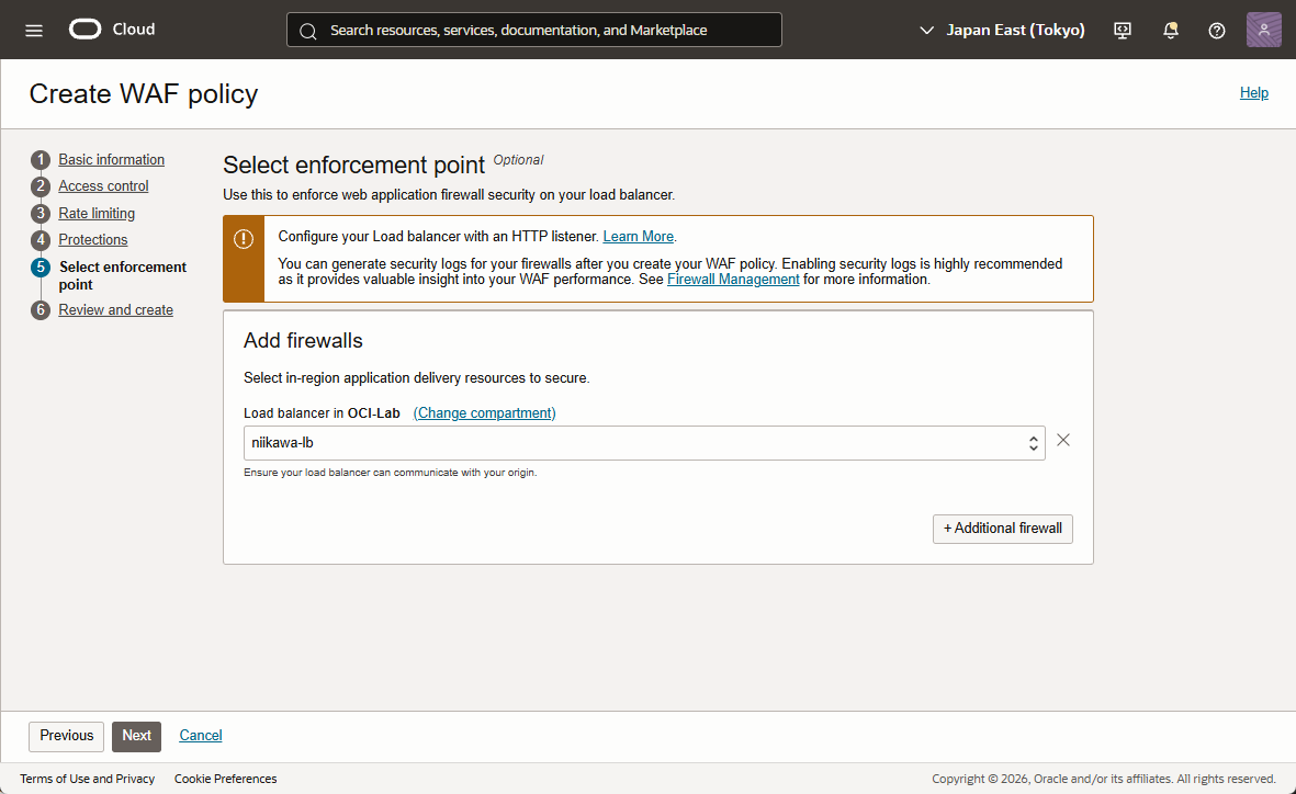 - Select enforcement point において、ファイアウォールを適用するロードバランサーを選択します。