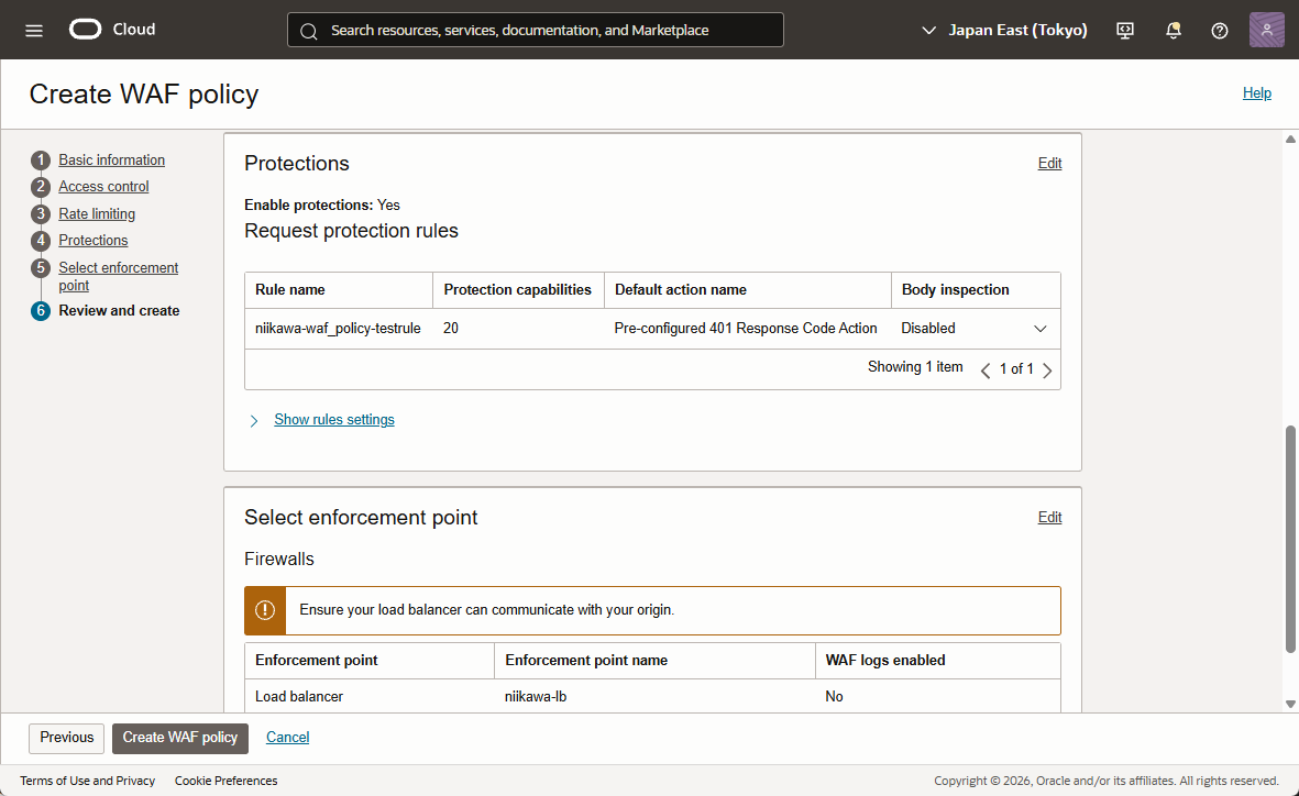 - Review and create において、「Create WAF policy」を選択します。
