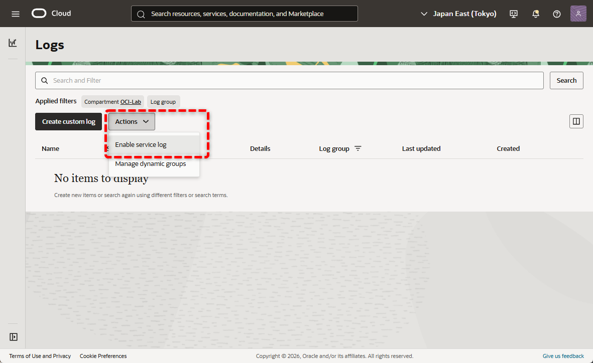 - OCIの管理コンソールにて、左ナビゲーションから「Observability & Management」→「Logging」→「Logs」を選択します。