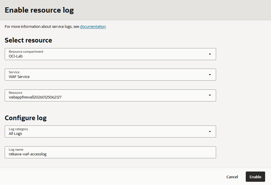 - Select resource において、Resource compartment を選択、Serviceに「WAF Service」を選択、Resource を選択します。