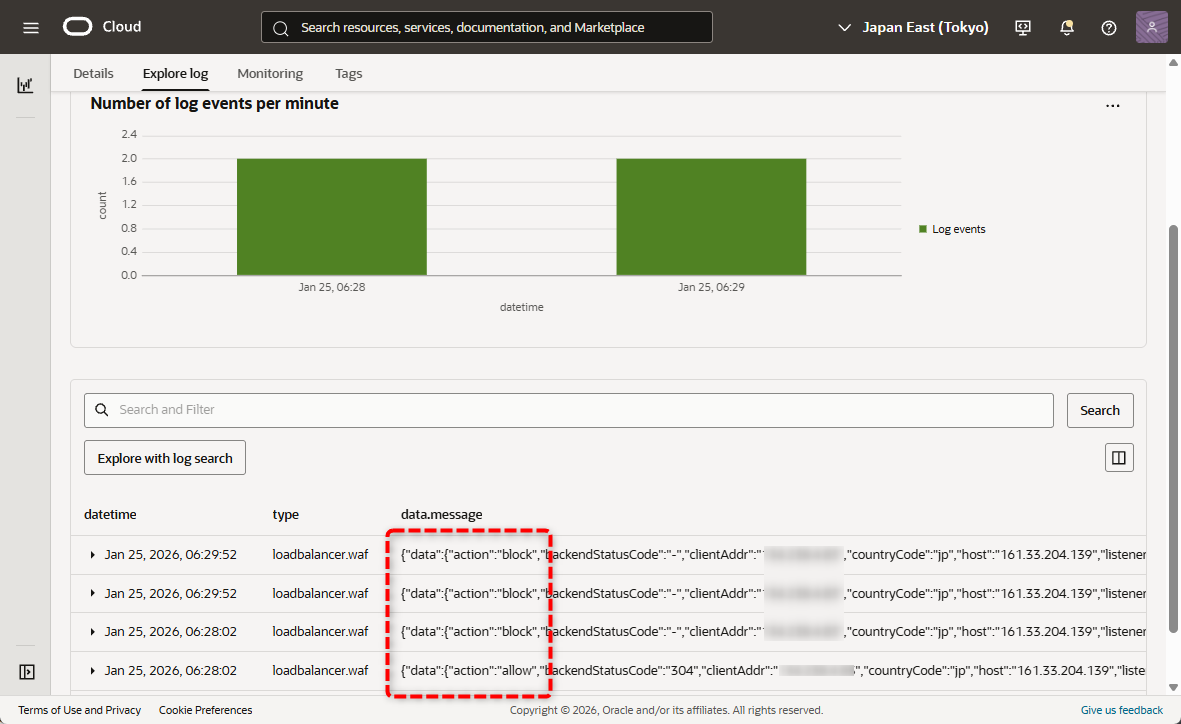 - ログ有効化後、ログが表示されるまで数分のタイムラグがあります。数分待ってから、再度攻撃検知テストを行います。以下のように”Block”や”Allow” を示すログが表示されることを確認します。合わせて、送信元アドレスのclientAddr が記録されているか、どのルールで検知されたかにも注目します。