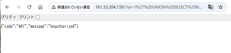 - 次は、WAF に追加したルールに対する攻撃検知テストを行います。ルールに設定した保護機能のSQL Injection (SQLi) (ルールID: 942270) の攻撃を模擬したテストを行います。攻撃を検知してアクセスがブロックされ、401 のエラーステータスが返却されることを確認します。