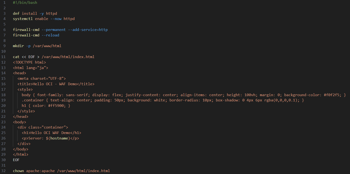 - Computeインスタンス起動時に、以下のCloud-init スクリプトを使用して、httpd のインストールとセットアップを行っています。