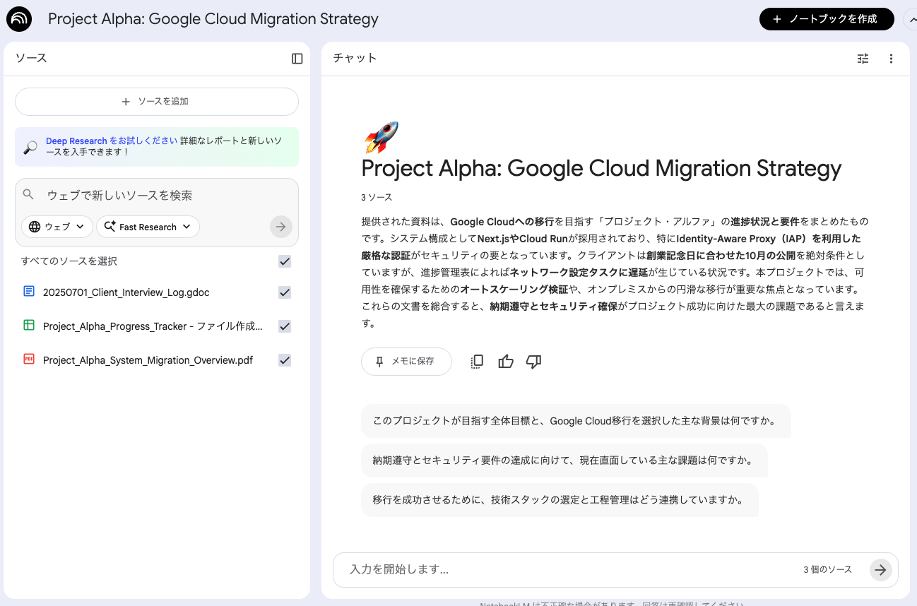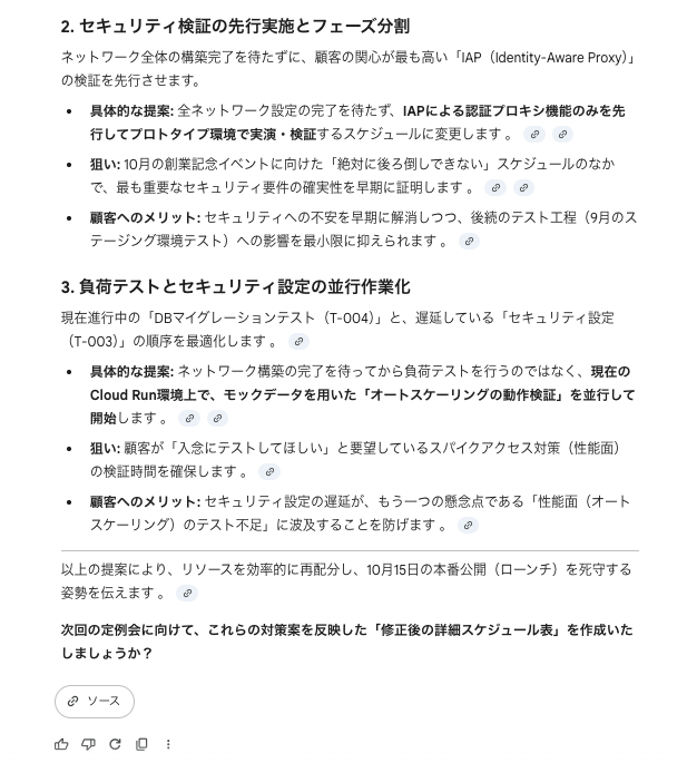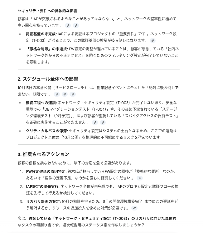 それらを組み合わせて、「現在のネットワーク設定の遅延は、顧客が重視するセキュリティ基盤の構築に直結するため、公開日が危うい」といった、資料を横断した深い分析を返してくれます。