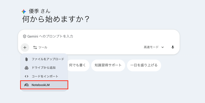 準備ができたらGeminiを開き、チャット欄の「+」ボタンからNotebookLMを選択し、先ほど作成したノートブックを追加します。