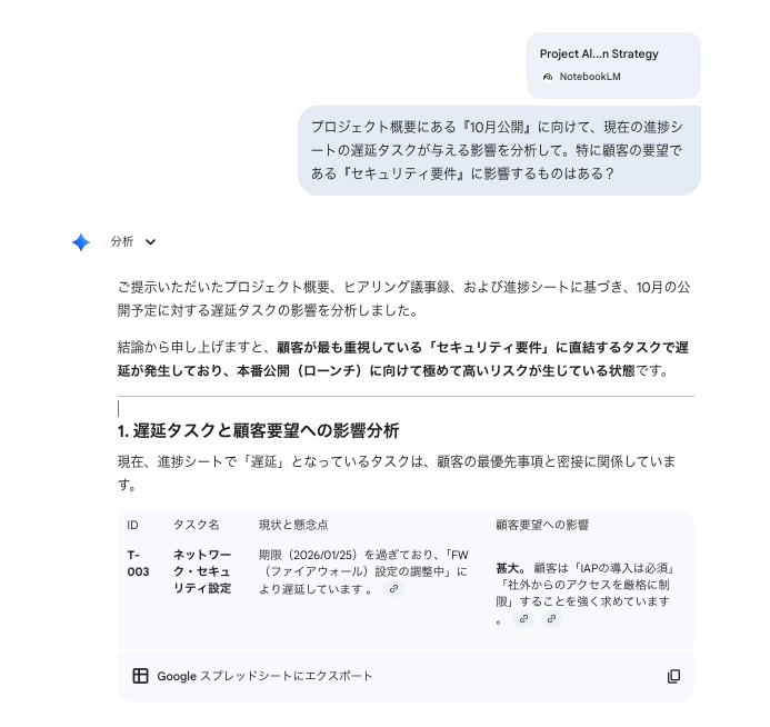 質問: 「プロジェクト概要にある『10月公開』に向けて、現在の進捗シートの遅延タスクが与える影響を分析して。特に顧客の要望である『セキュリティ要件』に影響するものはある?」