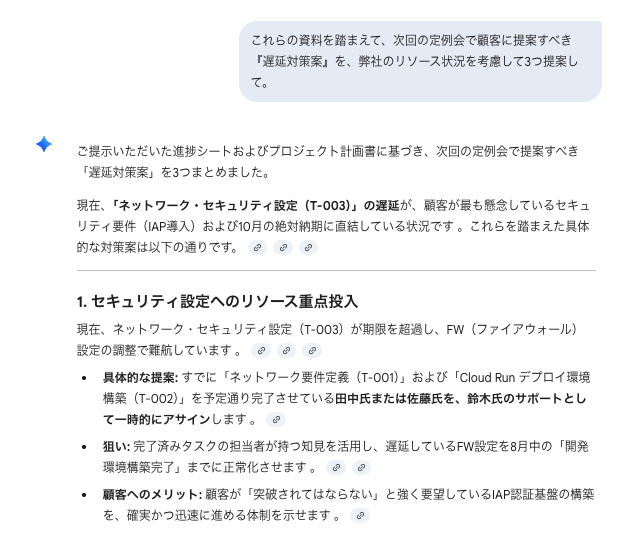 しかしGeminiは、「プロジェクトをリカバリするためには、こういう動かし方がベストである」という一般的なプロジェクト管理のベストプラクティスと、読み込ませた資料の文脈を融合させて回答しています。