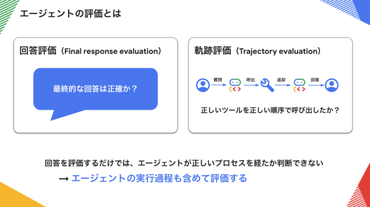 - ROUGE-1やLLM-as-a-judgeを用い、ADKのCLIなどで効率的に評価サイクルを回す実戦的なフローを紹介。