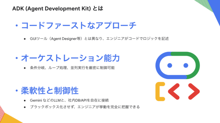 - GUIツールとは異なり、エンジニアがロジックを厳密に制御できるのがADKの強み。