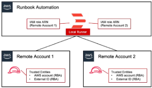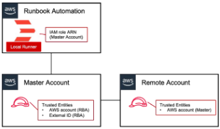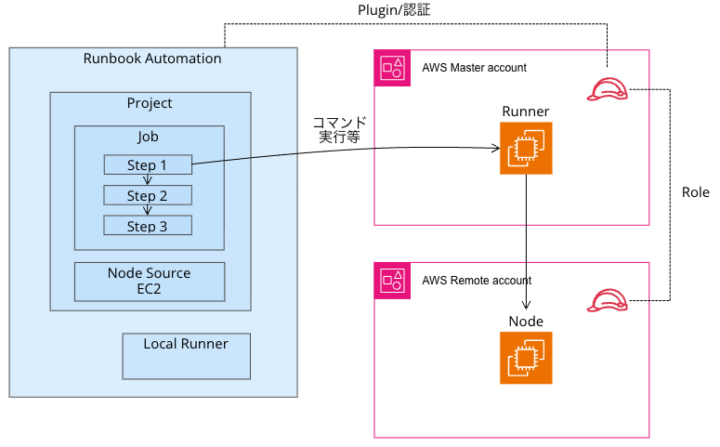 プラグインを設定したAWSアカウントと別のAWSアカウントをIAMロールで信頼関係を設定することで、クロスアカウントでの処理も可能となります。Runbook Automationプラグインを設定したAWSアカウント(MasterAccount)がハブとなるようなイメージです。