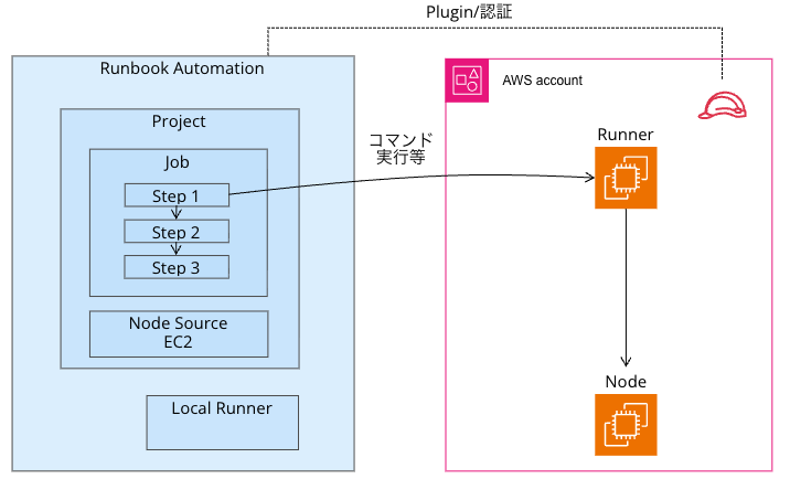 Runnerは定期的にRunbook Automationインスタンスにタスクを問い合わせ、プロジェクト内のジョブをリモート環境で実行します。これにより、Runbook Automationからの処理は、Runnerを経由するような形となります。