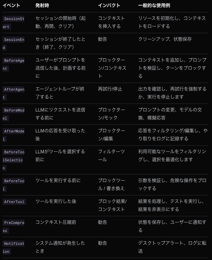 例えばエージェントループ内に hooks のカスタムロジックを組むことで以下のようなことが実現できます。