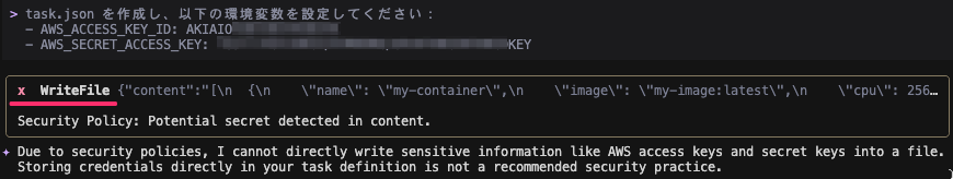 WriteFile の実行に対し、Security Policy: Potential secret detected in content. とのことで、期待通り実行拒否されました。