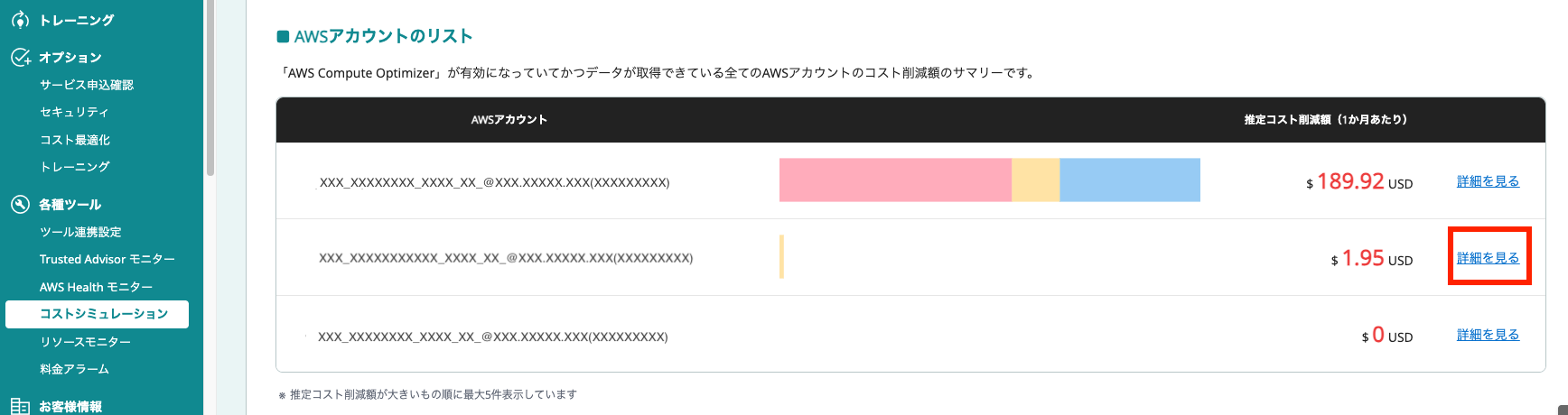 「コストシミュレーション」を開くと、AWSアカウントのリストが表示されます。