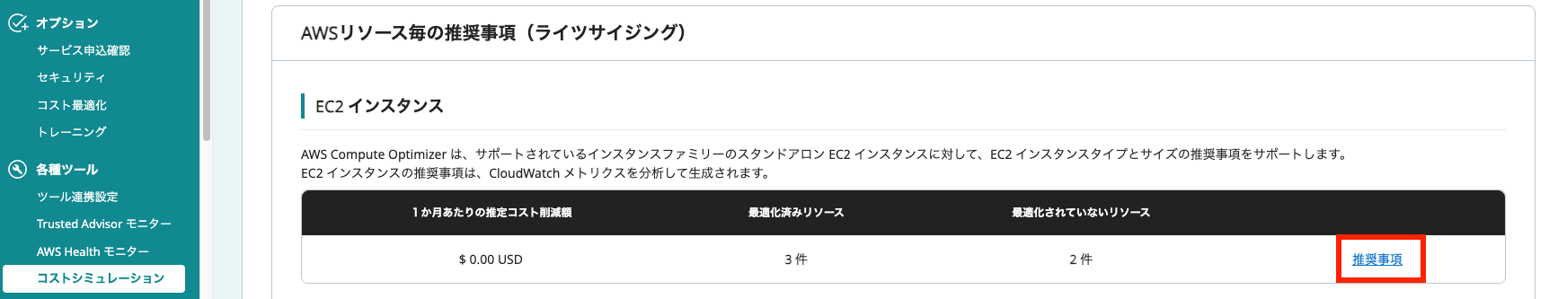 画面を少し下へスクロールすると、「AWSリソース毎の推奨事項(ライツサイジング)」 という項目があります。