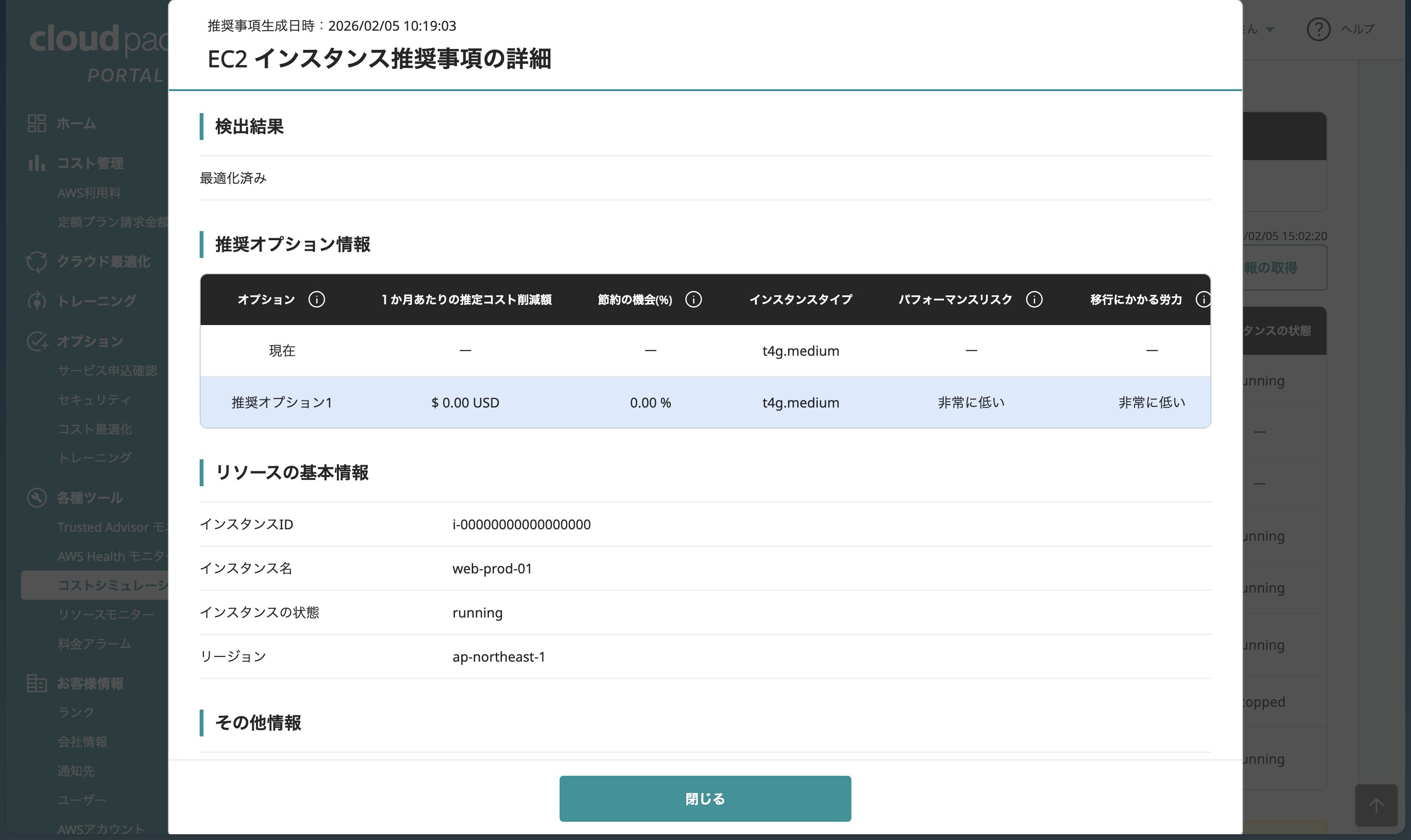 コストシミュレーションは、この「過剰スペック」を見つけ出し、「今の稼働状況なら、こちらのサイズに変更することでコストを最適化できますよ!」と提案してくれるのです。