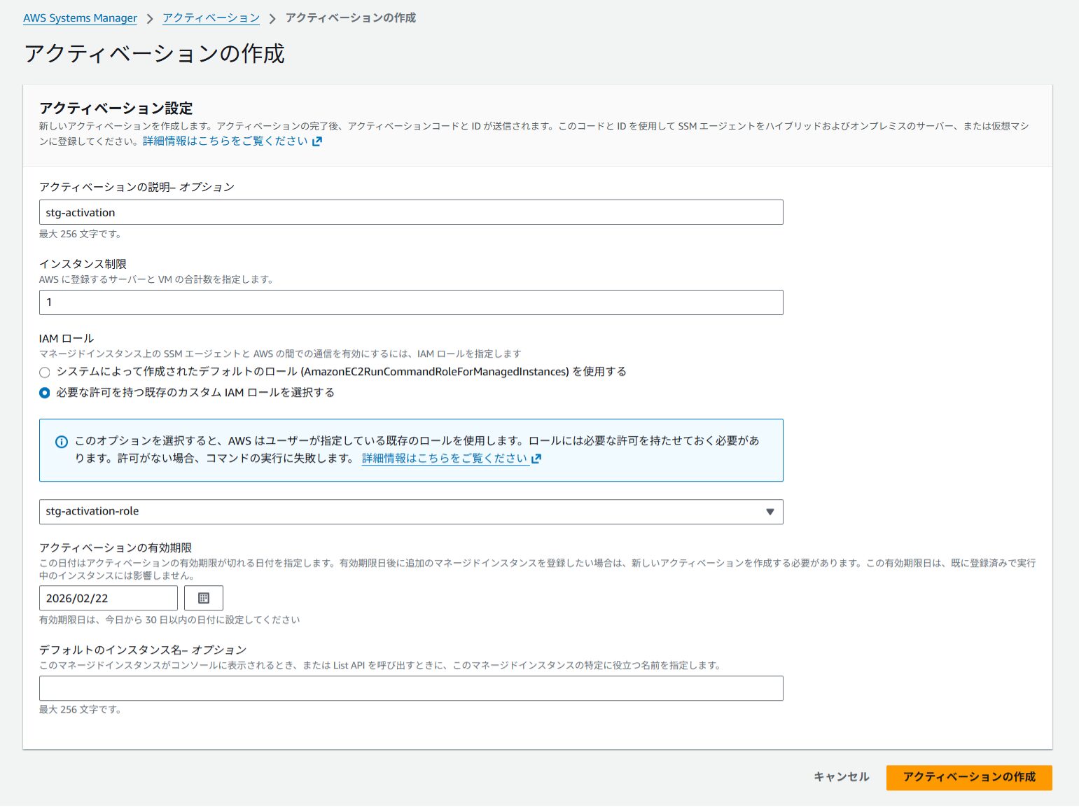 本構成では、ハイブリッドアクティベーションの作成時に IAM ロールを関連付けます。
