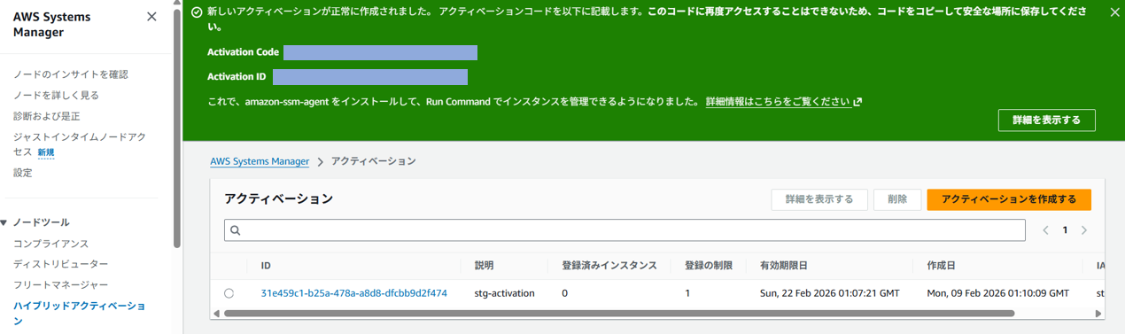 Systems Manager コンソールからハイブリッドアクティベーションを作成します。