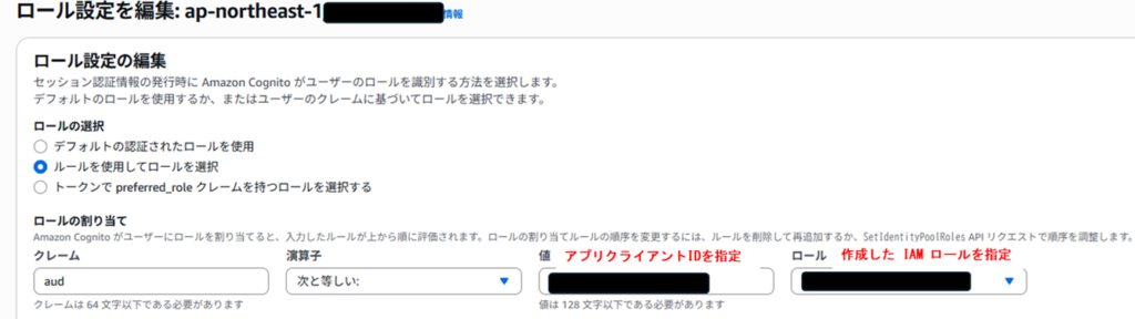 4. Cognito ユーザのクレデンシャル発行時に、作成した IAM ロールを割り当てる設定。