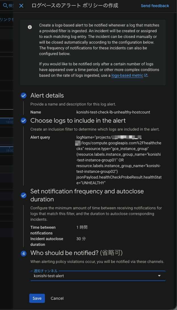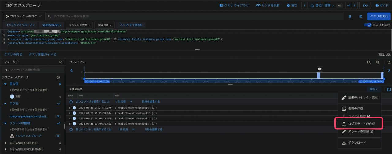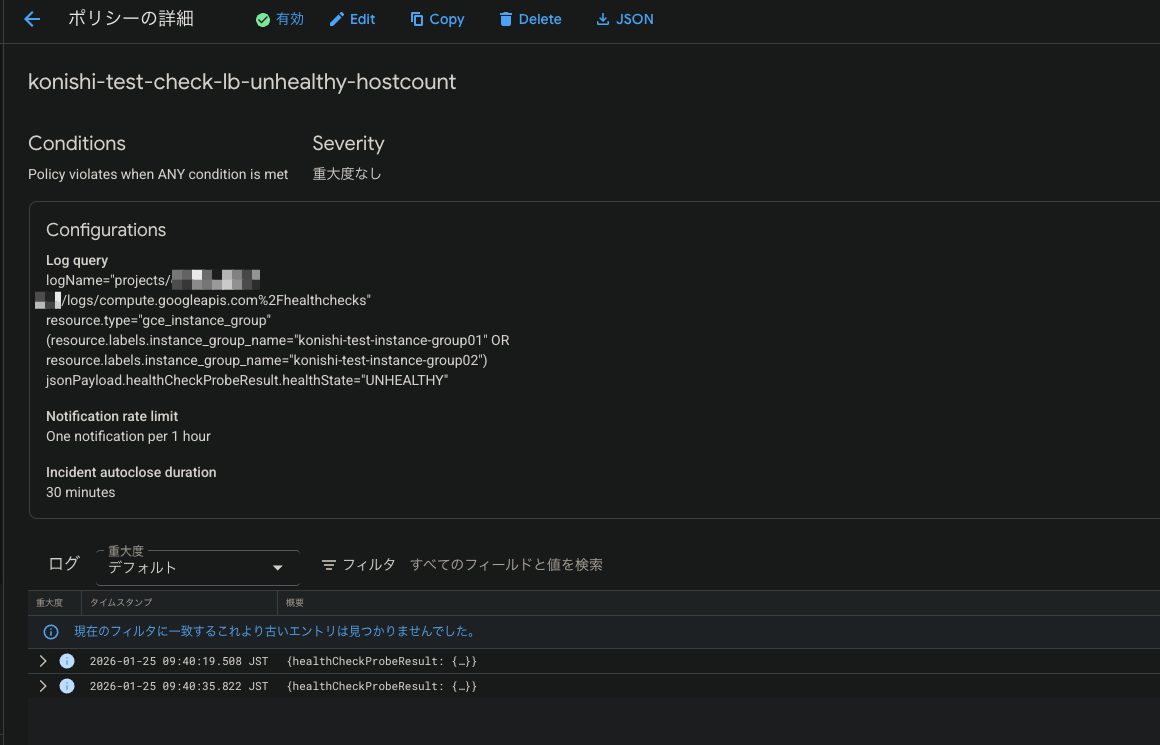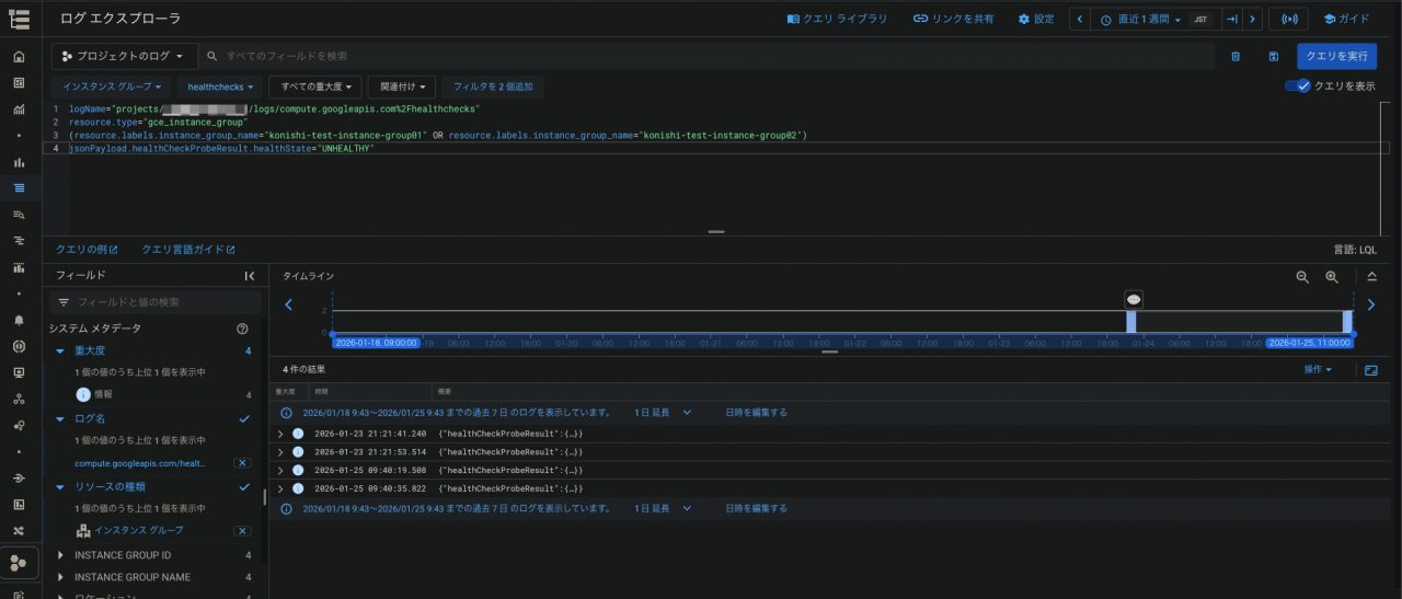 logName="projects/hogehoge-fugafuga/logs/compute.googleapis.com%2Fhealthchecks" resource.type="gce_instance_group" (resource.labels.instance_group_name="監視対象のインスタンスグループ名1" OR resource.labels.instance_group_name="監視対象のインスタンスグループ名2") jsonPayload.healthCheckProbeResult.healthState="UNHEALTHY"
