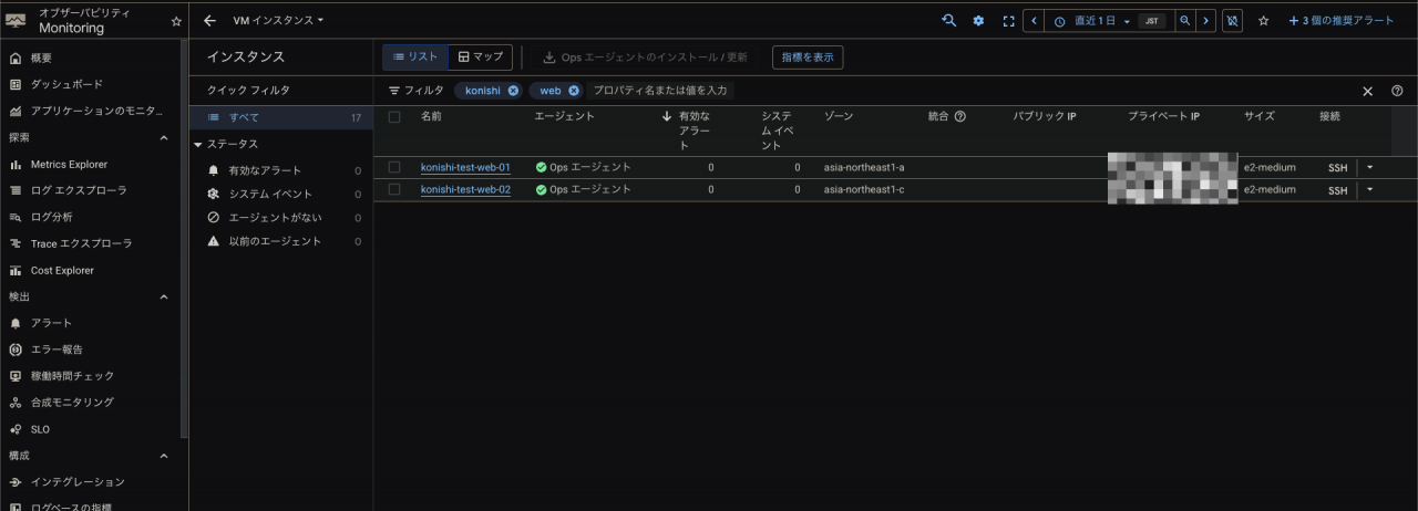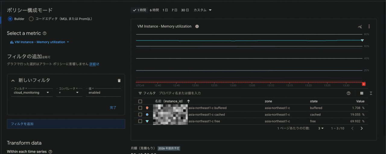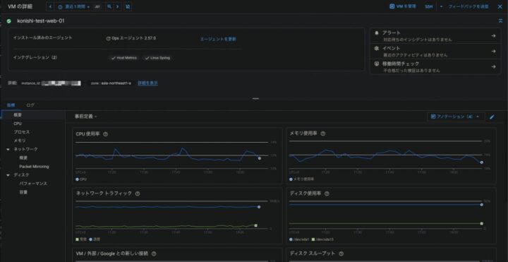 CPU使用率やプロセスなど、基本的なメトリクスは取れており、Opsエージェントもインストールされているため、特に追加の作業なしでアラート作成に進めそうです
